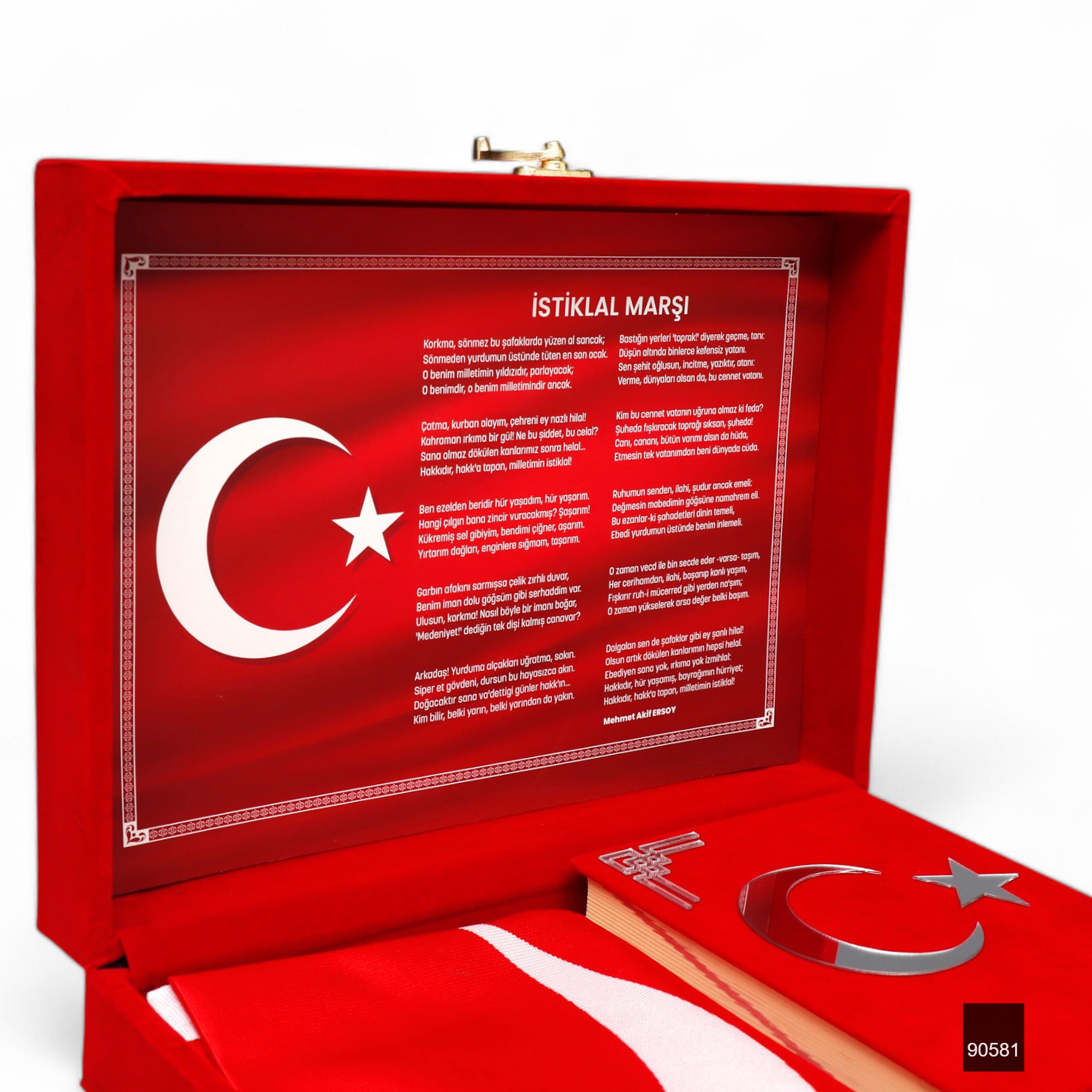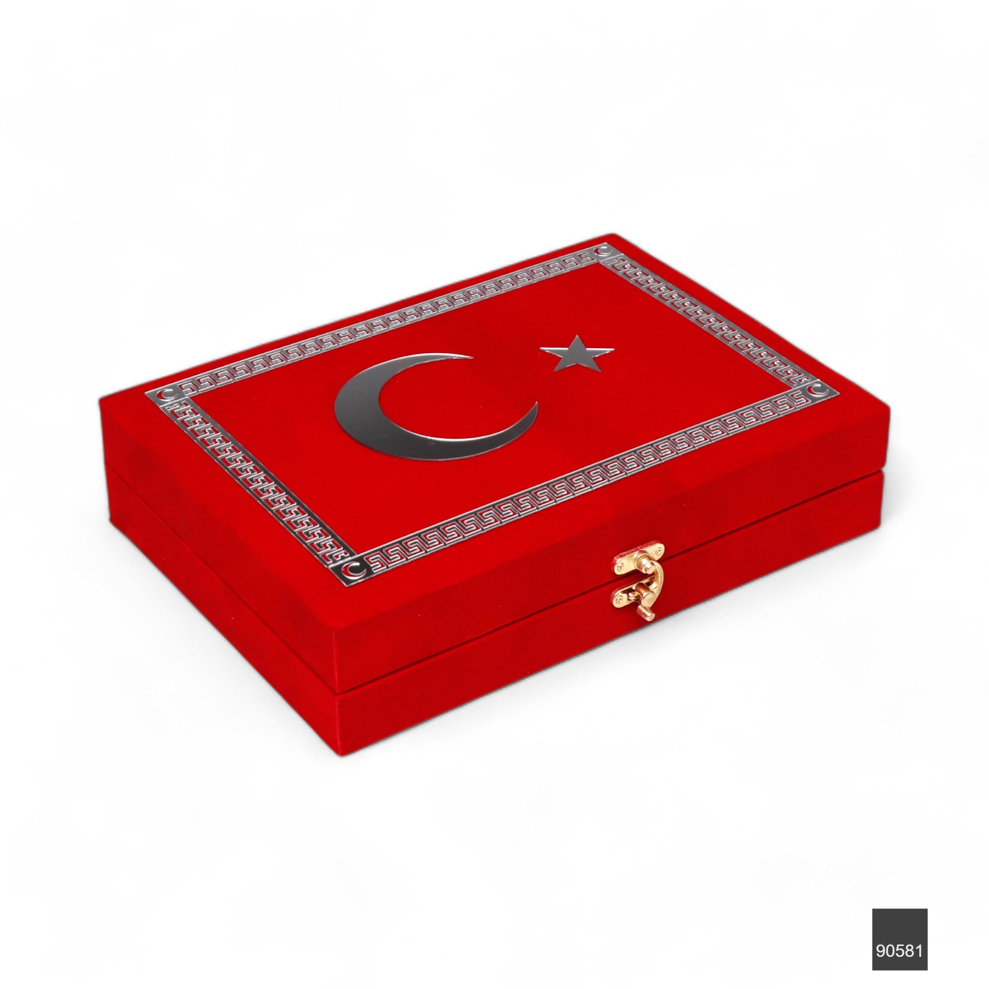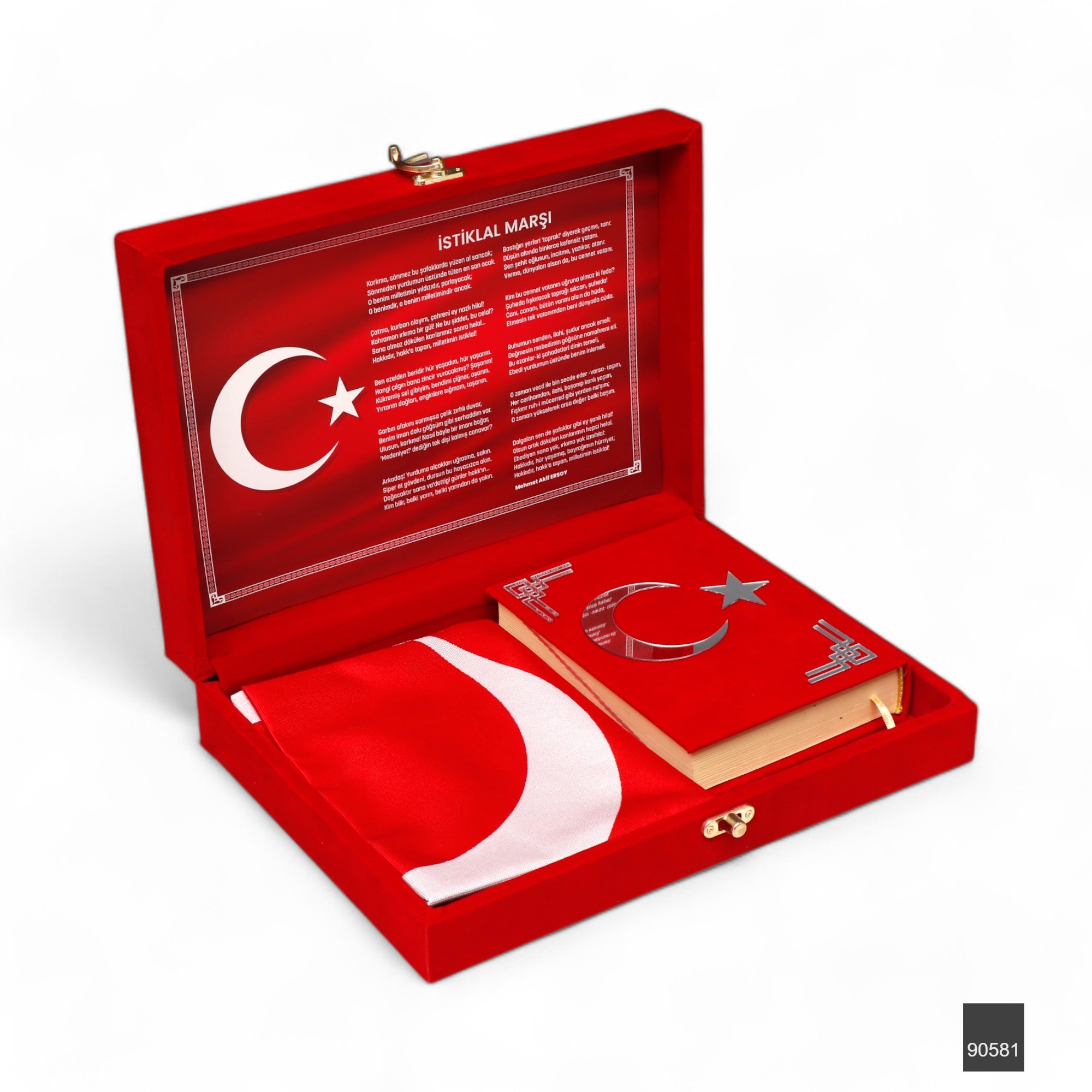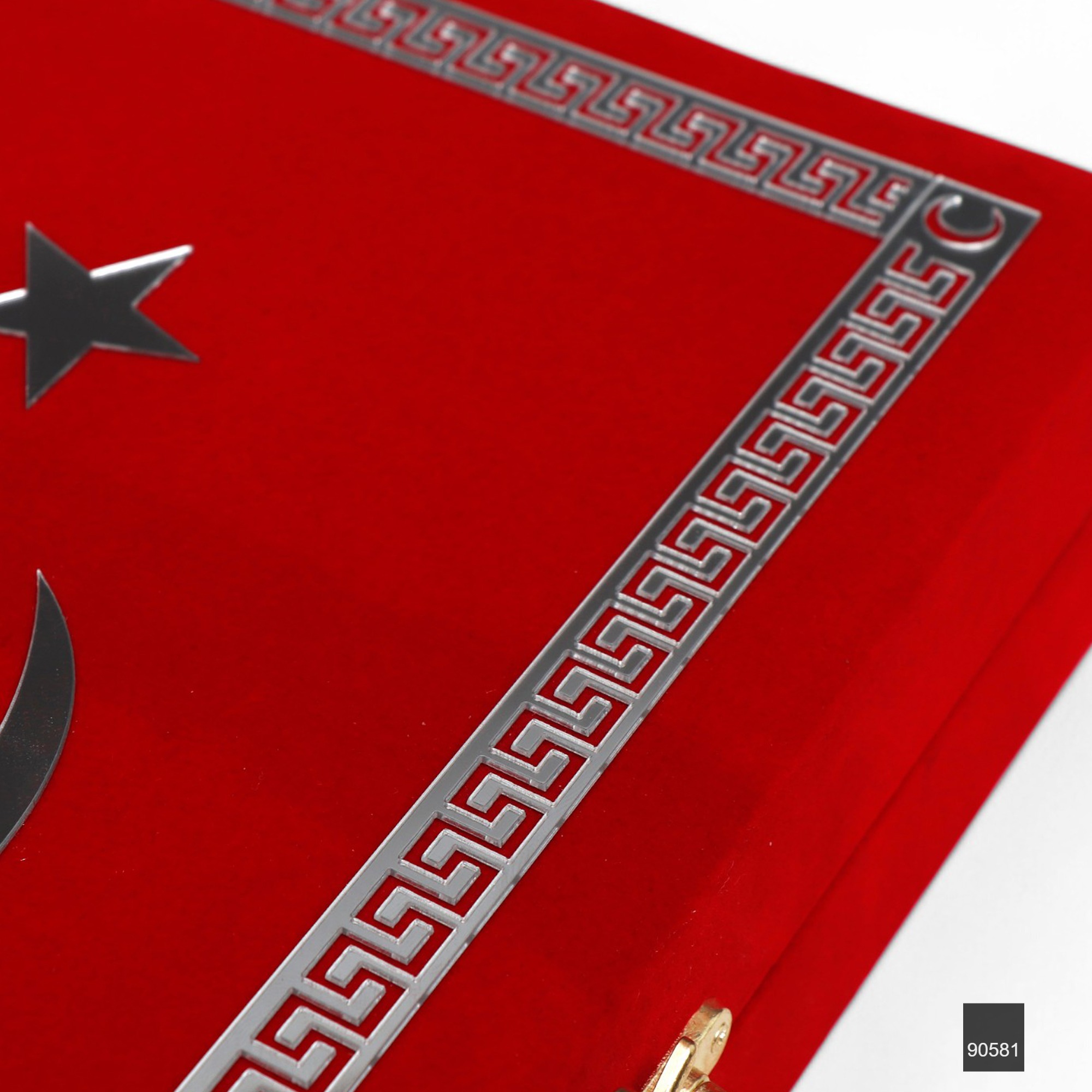 Sancak Serisi Lüks Kadife Kuran Kutusu + Sancak Serisi Çanta Boy Bilgisayar Hatlı Arapça Kadife Kuran-ı Kerim – Kırmızı